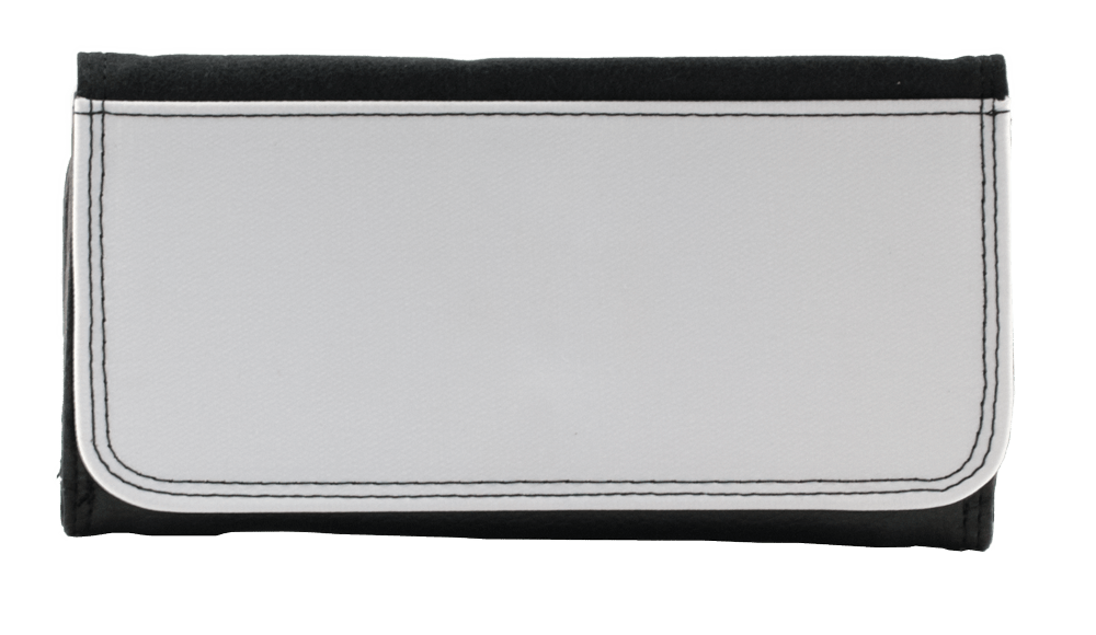 Make a fashion statement with sublimation wallets. This wallet is made of black faux leather and features a white fabric front for sublimation, two snap locks, multiple storage slots, check book insert, zippered coin pouch, and a bill slot.